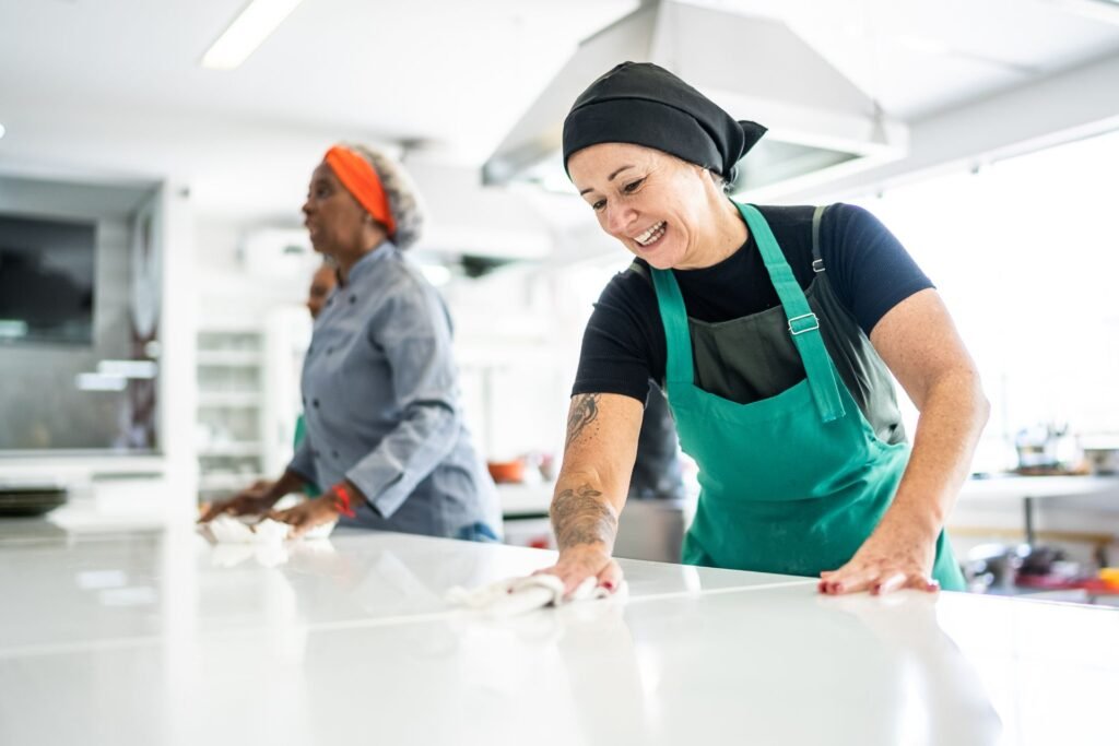 Restaurant and commercial kitchen cleaning services covering front-of-house and back-of-house areas, floors, restrooms, and service zones.